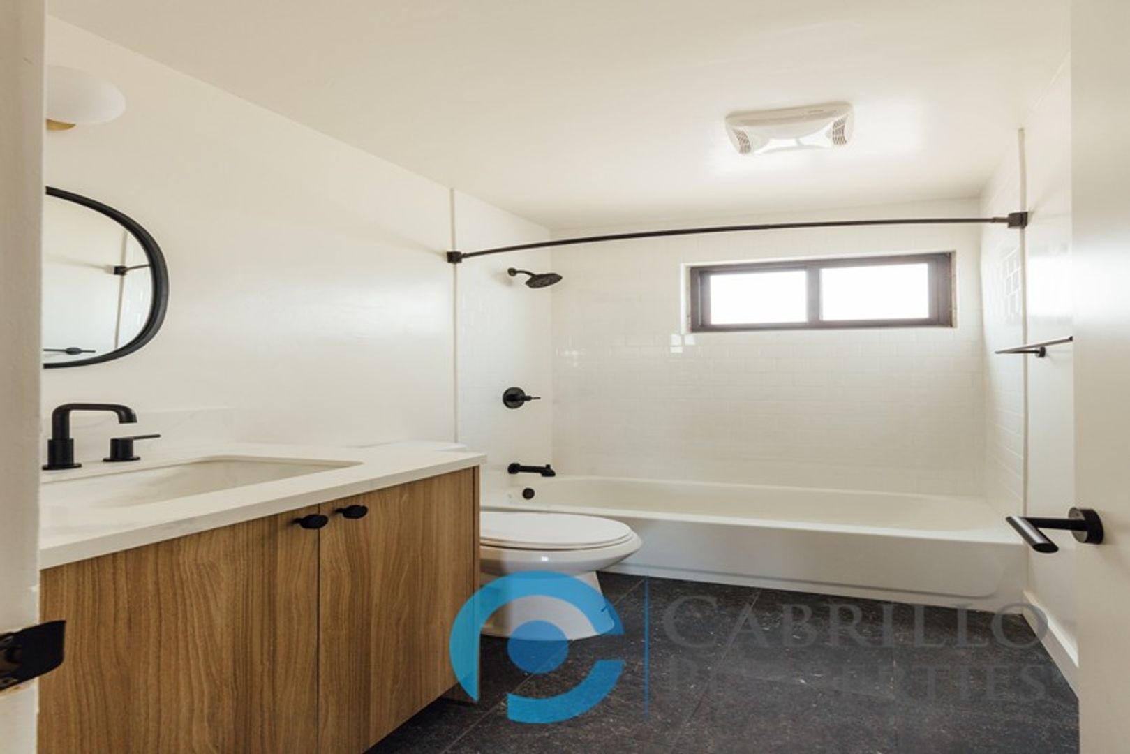 The fully updated bathroom offers a contemporary vanity with a quartz countertop, a tub/shower surrounded by clean white tile, and a slate-tile floor for a polished, spa-like feel.
