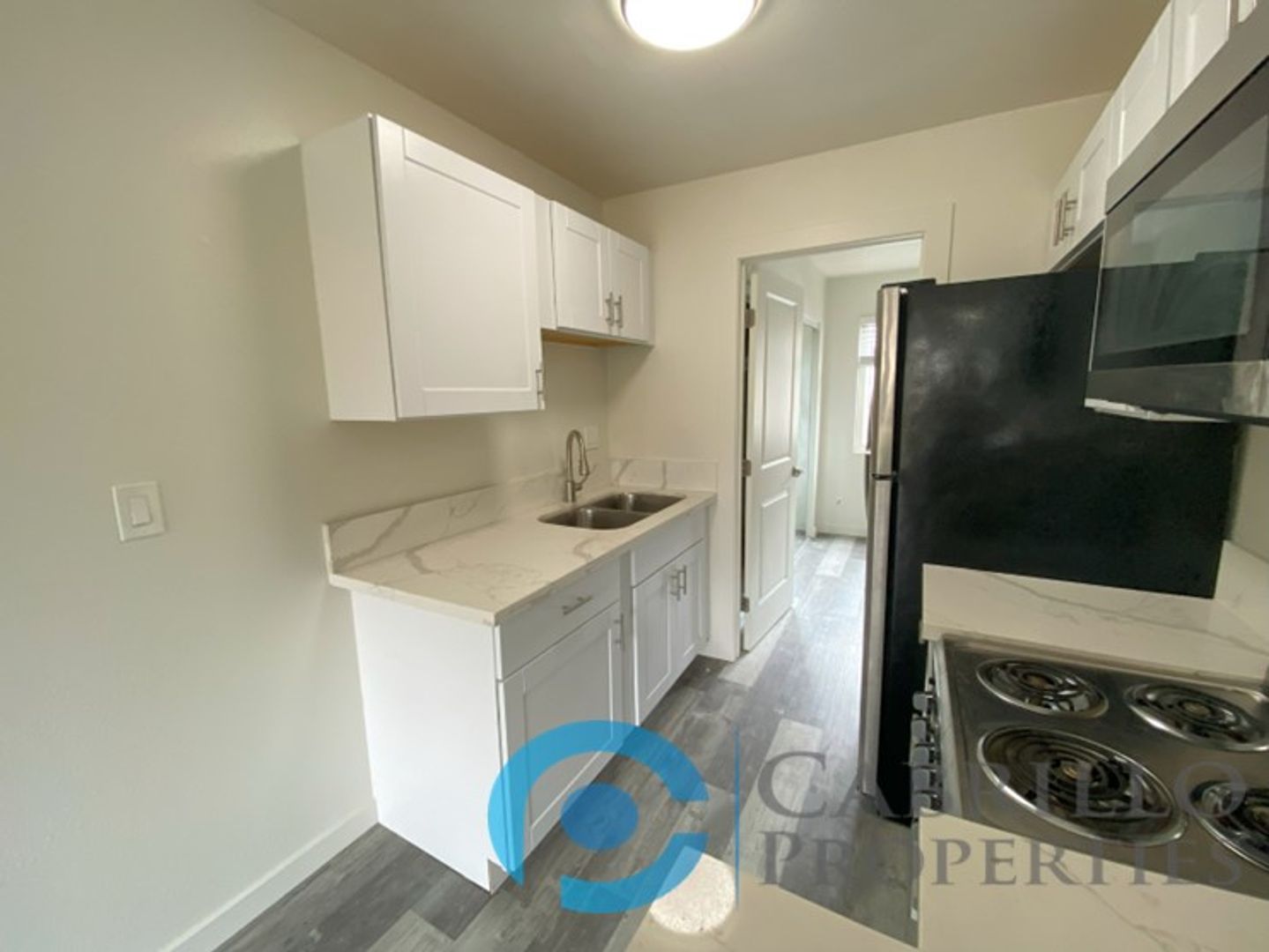 The kitchen has been fully updated, featuring crisp white cabinetry, marble-inspired countertops, and stainless steel appliances, including a full-size refrigerator, built-in microwave, and electric range. A double sink and ample cabinet storage make cooking and cleanup effortless.