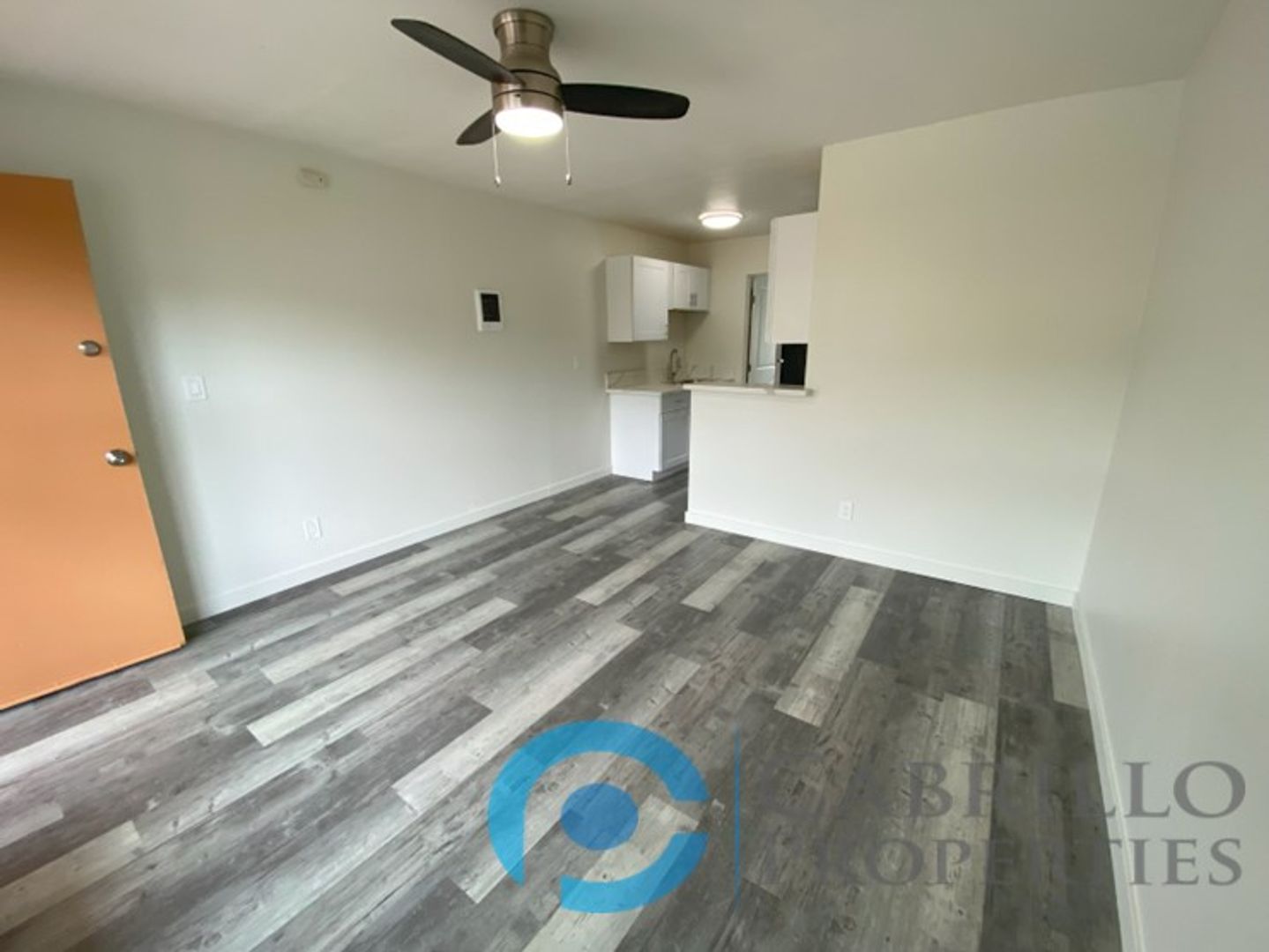 The open-concept living area flows seamlessly from the kitchen, showcasing wood-style flooring, abundant natural light, and ceiling fans for year-round comfort.