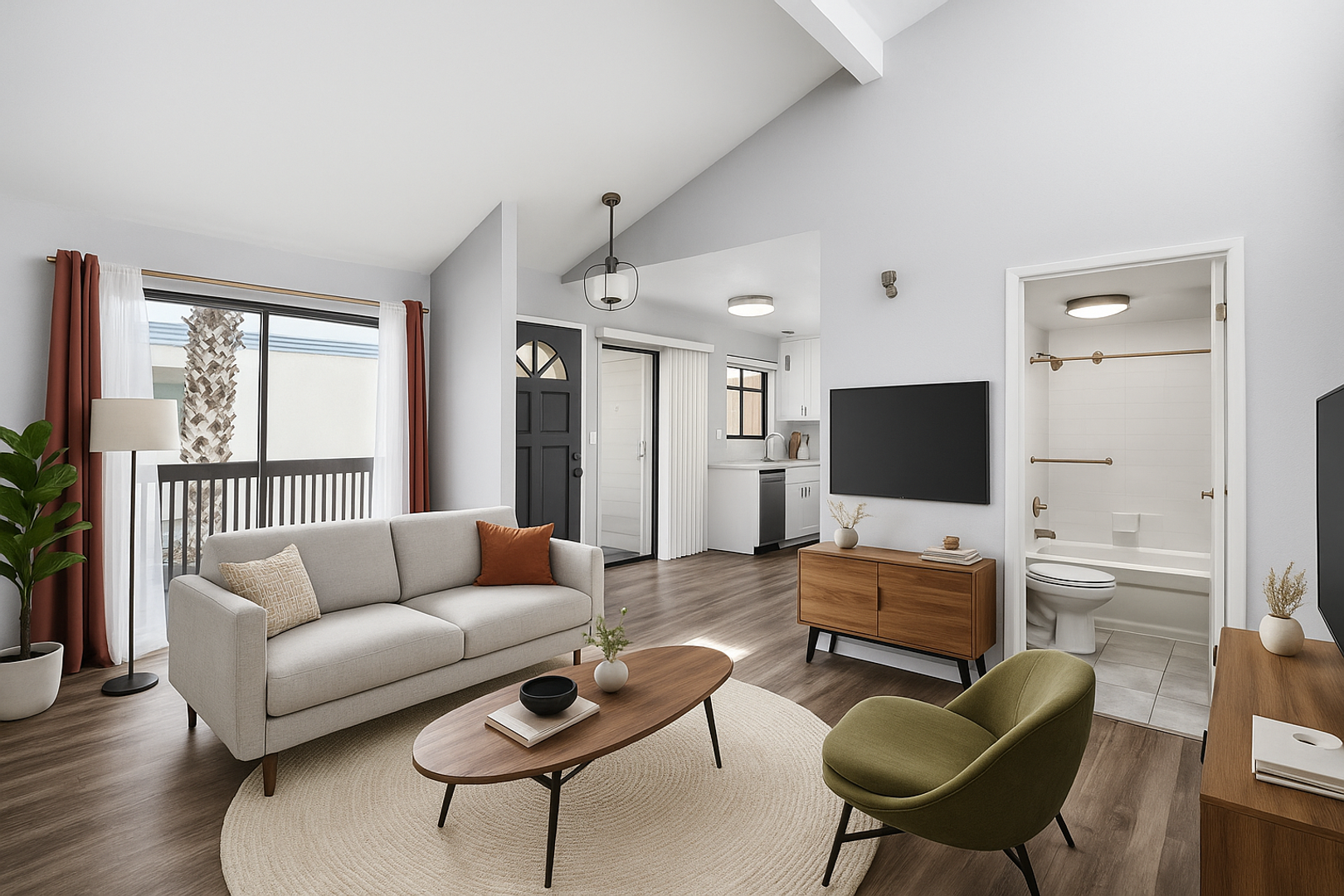 Cathedral ceilings and expansive windows fill the space with abundant natural light, enhancing the open and airy atmosphere. This top-floor home also features central A/C, in-unit laundry, a private patio, and a 1-car garage with additional driveway parking.